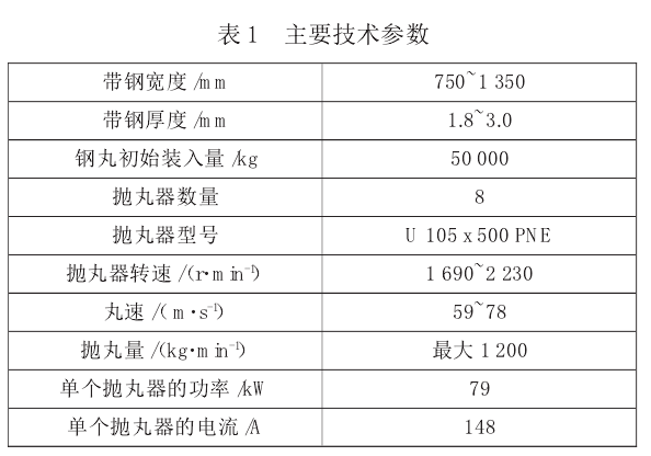 熱軋硅鋼帶在進行冷軋以前,一定要進行酸洗。酸洗的目的是除鱗、去氧化層。對硅鋼帶,一般采用拋丸酸洗法。拋丸的目的是對帶鋼表面進行連續除鱗,帶鋼表面經丸粒連續打擊,使表面氧化鐵皮松落,從而提高酸洗效果。首鋼某常化酸洗機組用于為下游的二十輥機組提供合格的原料鋼卷,主要生產無取向高牌號硅鋼和取向硅鋼,該機組在其酸洗槽入口設置了拋丸機,該拋丸清理機是由 DISA 公司設計制造。以下主要對拋丸機的設備結構進行分析。
