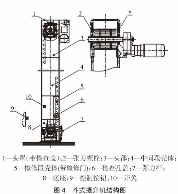斗式提升機采用皮帶傳動,用于將丸砂提升到一定高度供拋丸機使用,主要由底座、檢修段殼體(帶檢修門)、中間段殼體、頭部、驅動裝置、止逆裝置、張緊裝置、皮帶、畚斗組件、開關以及現場控制按鈕等部件組成,其設備結構圖如下頁圖4 所示。皮帶由氣缸自動控制張緊,張緊力設為1.5~3 bar(用耐熱皮帶時張力設為0.5 bar)。
